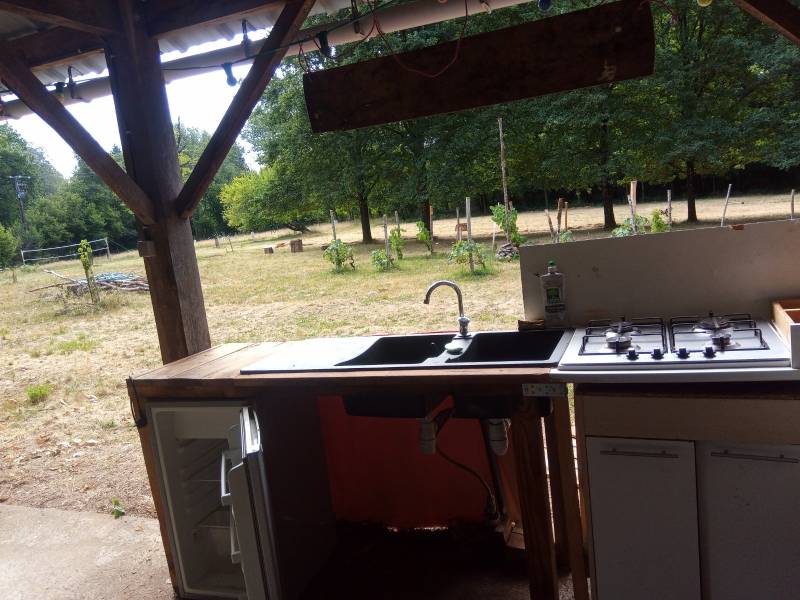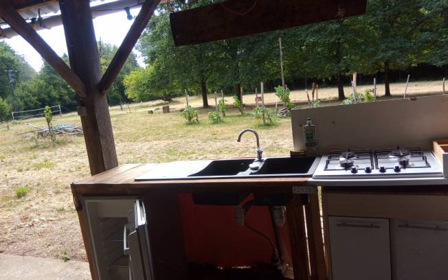 Une cuisine extérieure est à votre disposition avec gaz et électricité. Le terrain est plat et de l'ombre est accessible :)