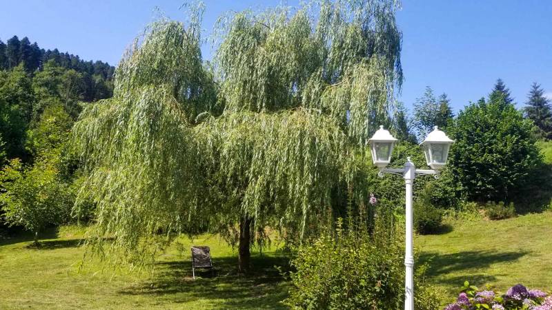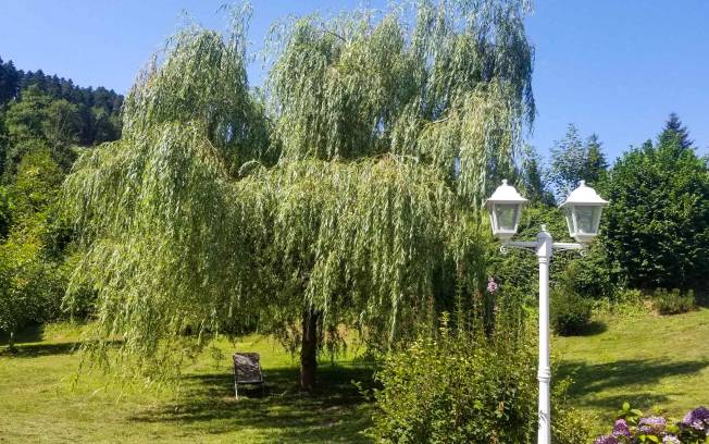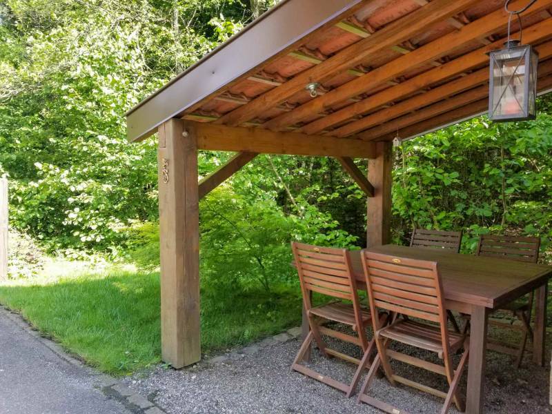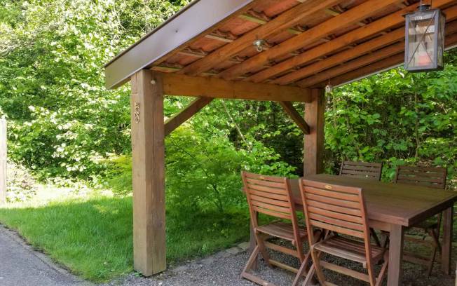 Espaces de détente et lieu de pique-nique couvert dans un jardin de 15 ares.