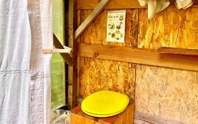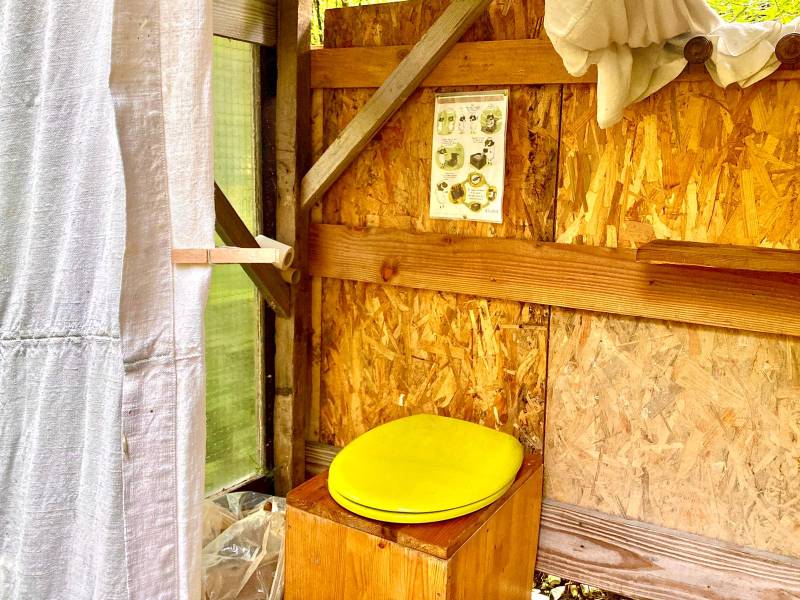 Nous proposons des toilettes sèches et une cabine pour la douche. Nous fournissons des douches solaires à la demande.