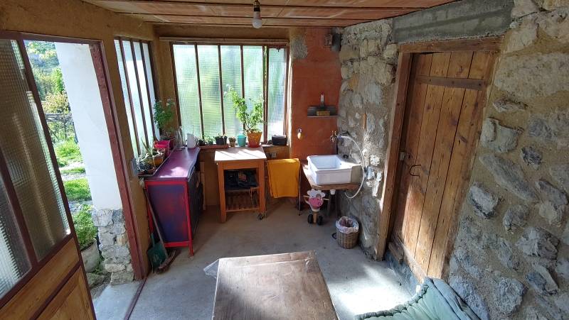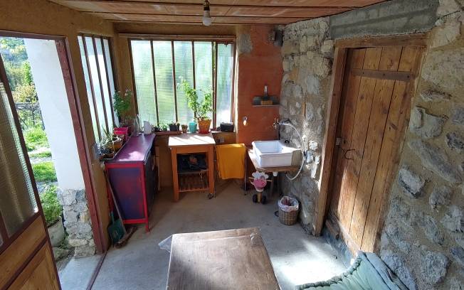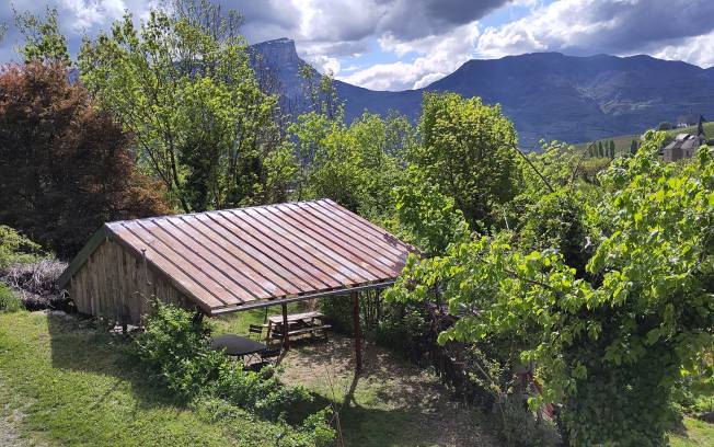 Toilettes sèches en extérieur, espace à l'abri pour manger en cas de pluie et charger des appareils électriques.