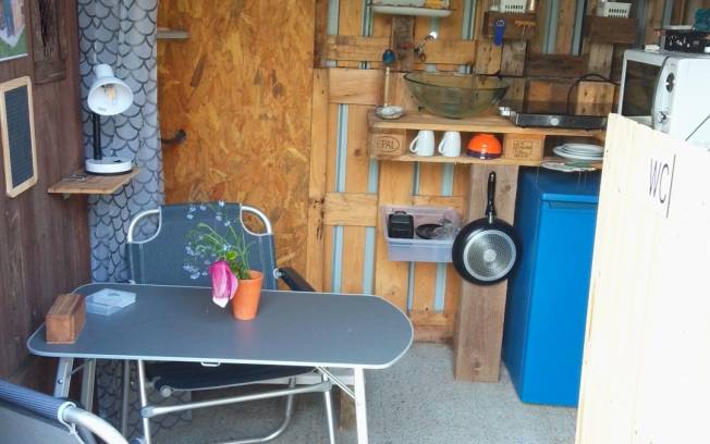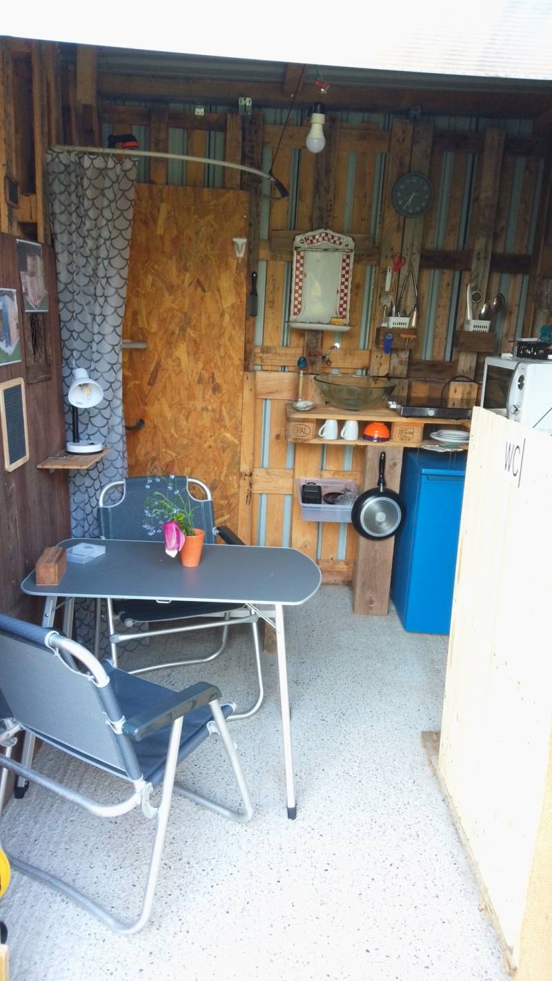 Services inclus dans le prix: eau, douche (eau chaude), électricité, pose d'une tente, accès à la cabane (frigo, plaques de cuisson, micro ondes, cafetière avec café, évier), barbecue, WC sans eau à disposition.