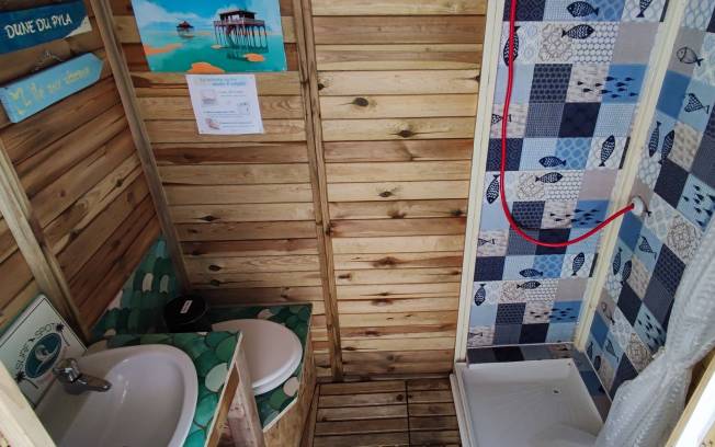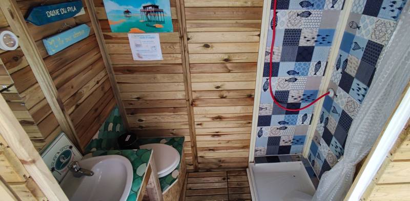 Ici vous aurez accès à un espace sanitaire avec toilettes sèches, douche avec eau chaude, lave-mains et miroir.