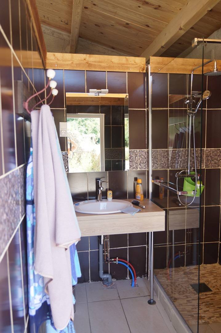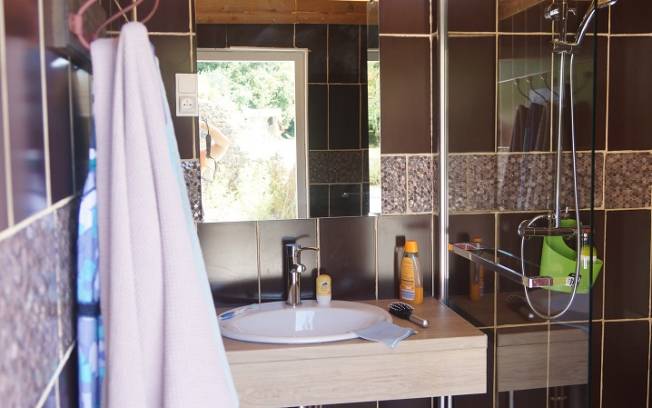 Au centre, nous avons un "bloc sanitaire" avec toilette, douche, coin cuisine.