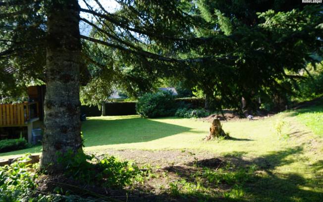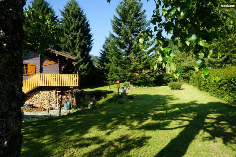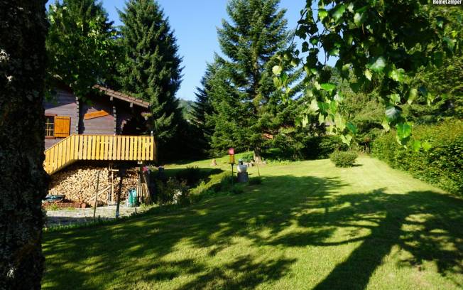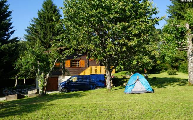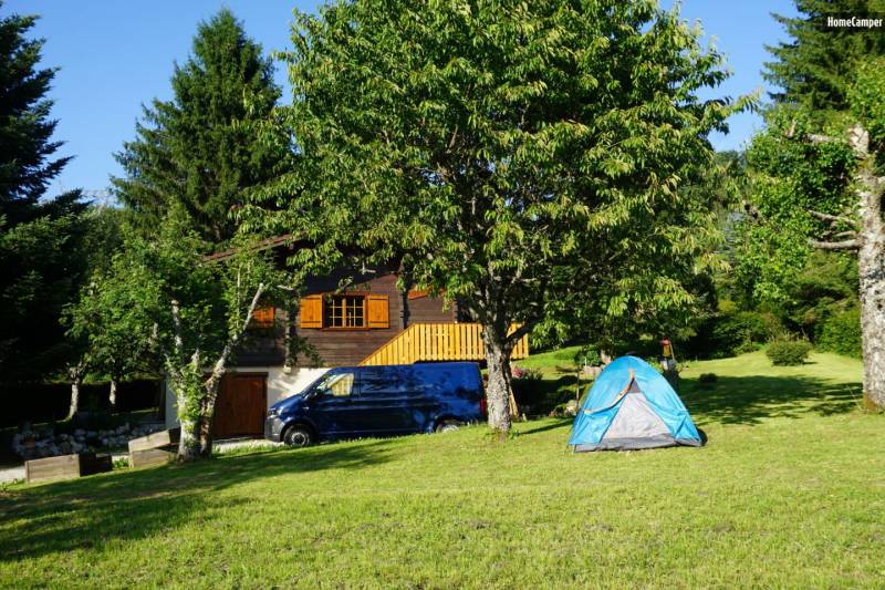 Le terrain est plat et engazonné. Vous avez de l'ombre pour planter votre tente de taille moyenne. Au pied du chalet à l'ombre du cerisier il est possible d'installer votre van de taille moyenne type Combi WV.