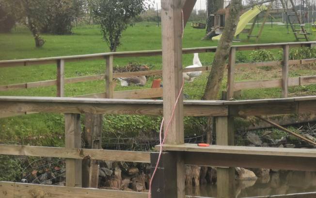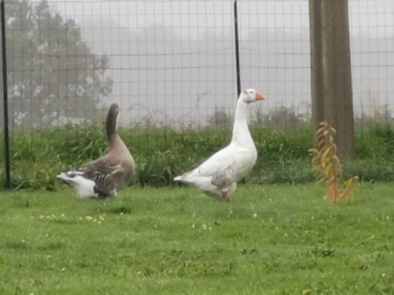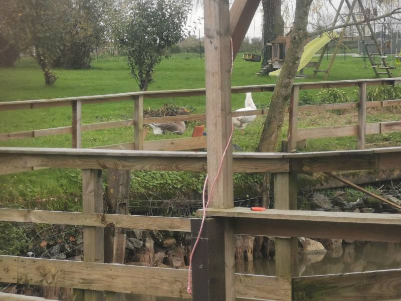 Terrain en bordure d'une marre naturelle clôturé avec oies et poules en liberté. Possibilités entretiens vélo sur place
