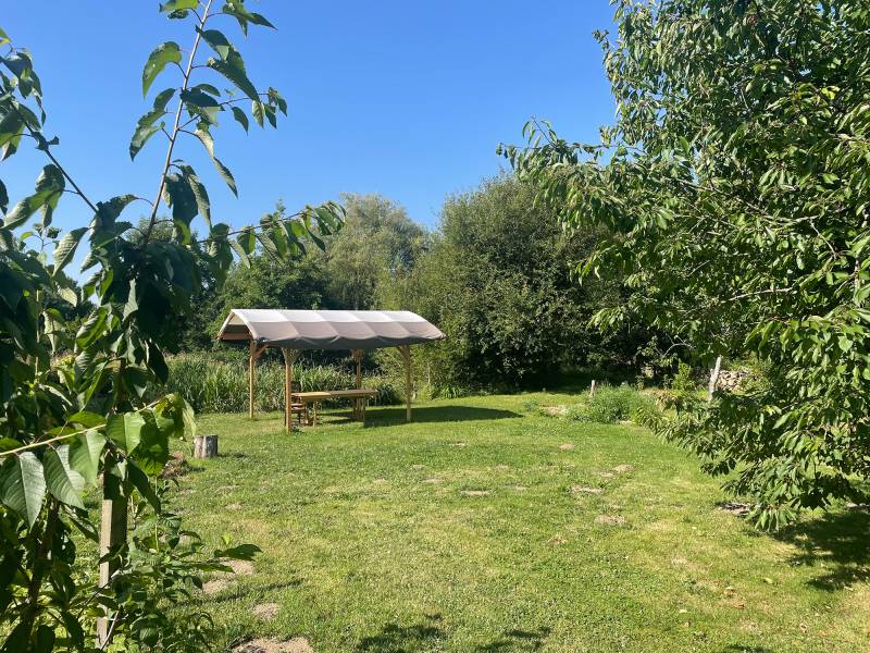 Sur la prairie de la cidrerie, de 2500m2, vous pourrez choisir librement votre emplacement pour votre tente, van, camping-car ou roulotte. Une pâture est également disponible pour vos animaux pendant la bonne saison. À proximité, une mare peuplée de carpes (qui adorent le pain sec) et de grenouilles chanteuses animera vos soirées de ses mélodies naturelles !