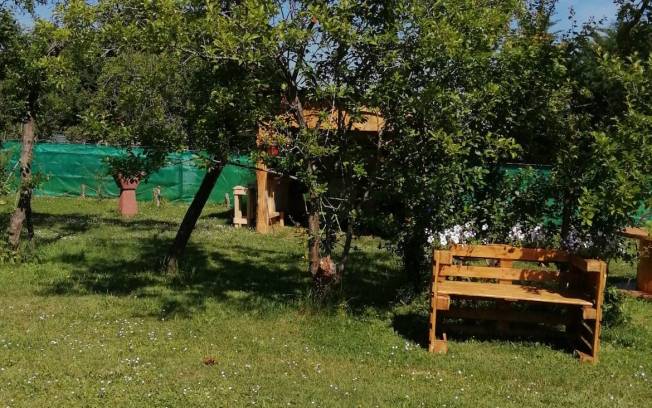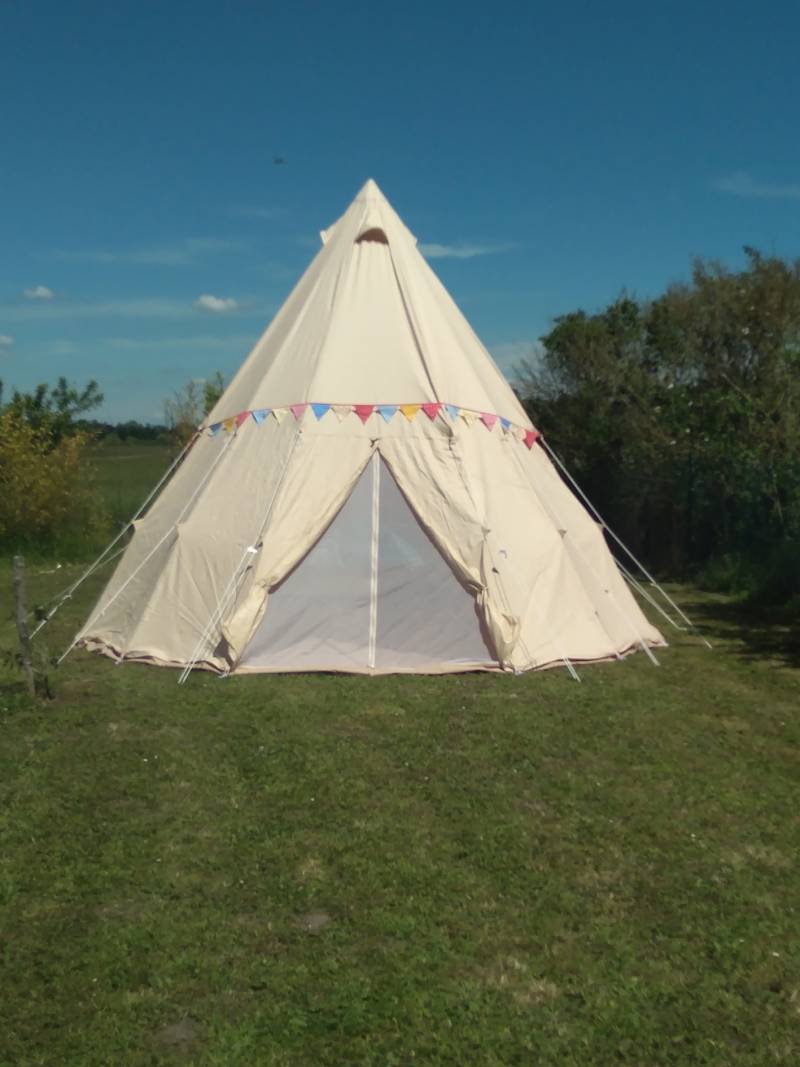 Tipi avec lits doubles gonflables, installé sur un terrain clos, ensoleillé et arboré de fruitiers.