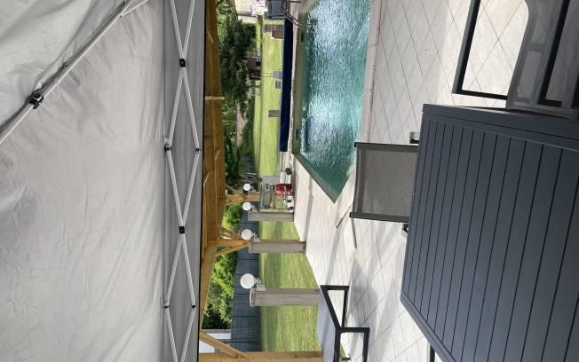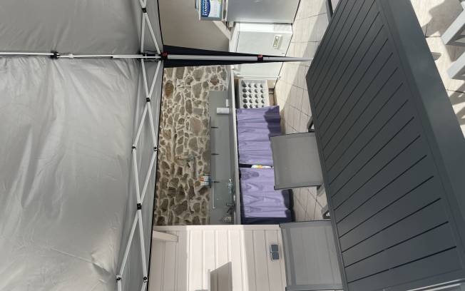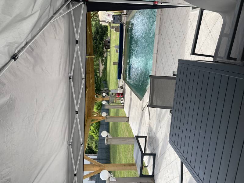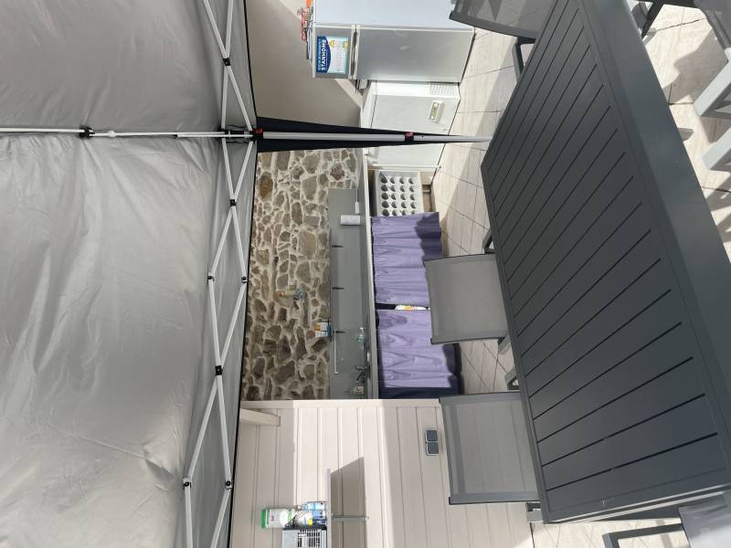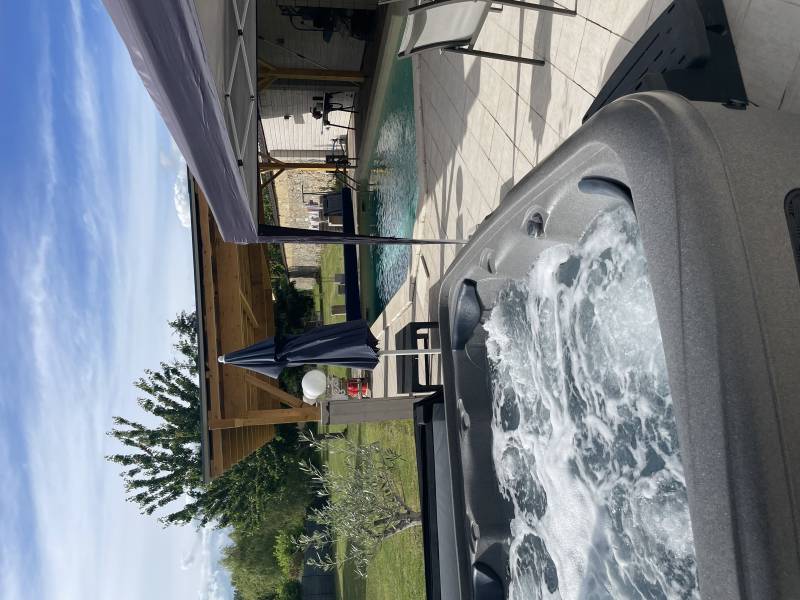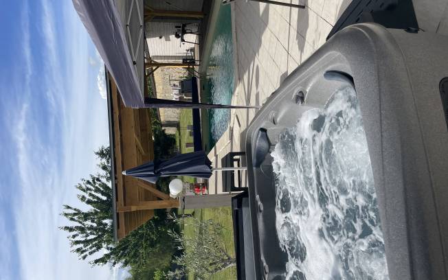 Douche, toilettes, cuisine extérieure avec frigo et congélateur, piscine 4X8 chauffée, spa 6 places, tables et chaises, cour gravier pour parking voiture à partager.