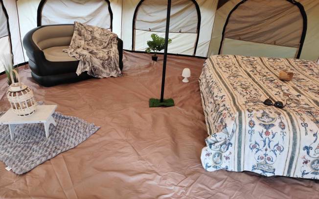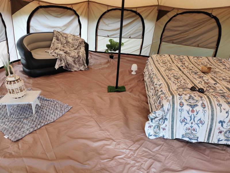 Tente yourte a disposition pour une ou plusieurs nuits en amoureux aménagée d un lit gonflable, d un petit canapé gonflables , de plantes , d une petite table et quelques décos..