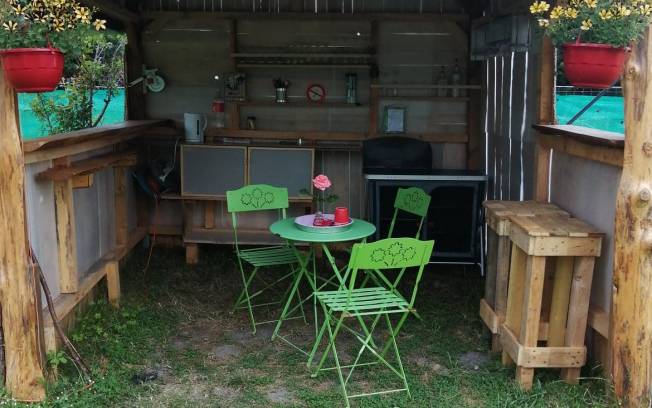 Vous disposez d un abri cuisine avec un peu de vaisselle, des toilettes sèches et une douche solaire .