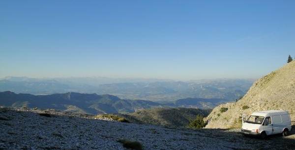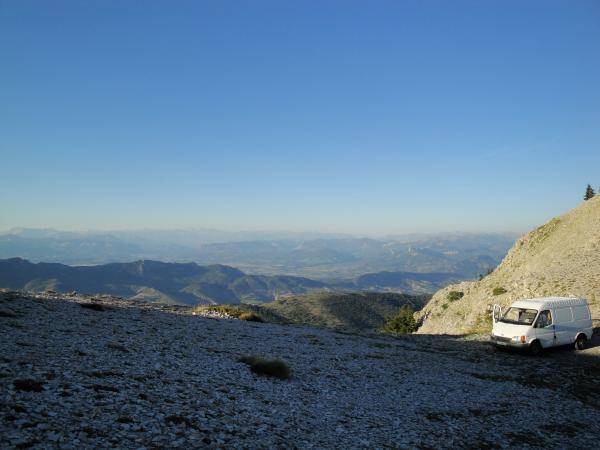 Beaucoup de coins où poser le fourgon ou la tente. Notre choix à été juste avant le sommet avec vue panoramique à 360° sur la Provence, le Mont Ventoux, le Dévoluy, les Hautes Alpes...