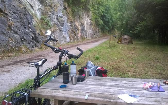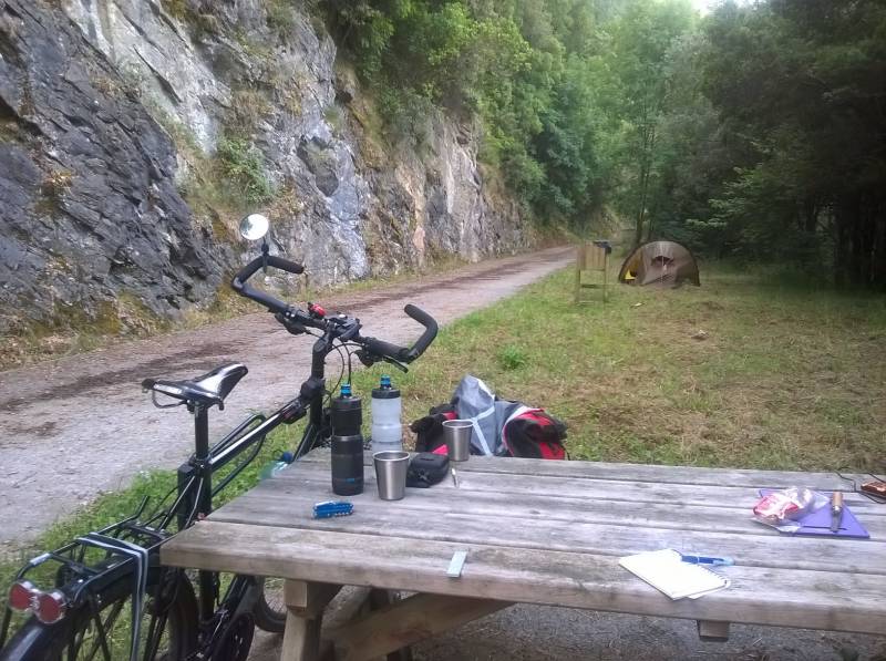 Il y a deux tables de picnic et une zone pour planter sa tente, bien qu'un peu cabossée. Il y a très très peu de passage car les villages les plus proches sont loin (environ 10km de part et d'autre). Nous avons croisé seulement deux VTTitstes, le dernier vers 18h et la premier vers 8h30 du matin.