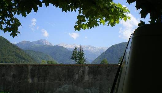 Emplacement très chouette derrière le cimetière de Tolmin : belles vues sur les montagnes, la Soca à nos pieds ... tranquillité.. (la bourgade a l'habitude d'y voir se tenir un festival de métal, donc de simples bivouacqueurs ...)