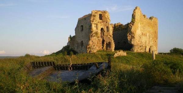 Au pied d'un chateau en ruine, sur une pointe, des jolis bateaux échoués ...