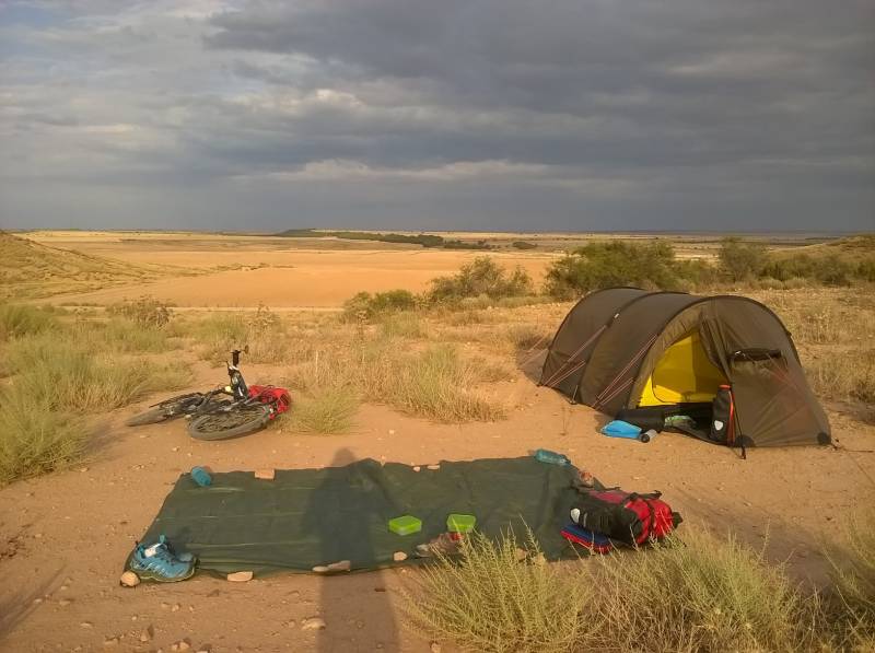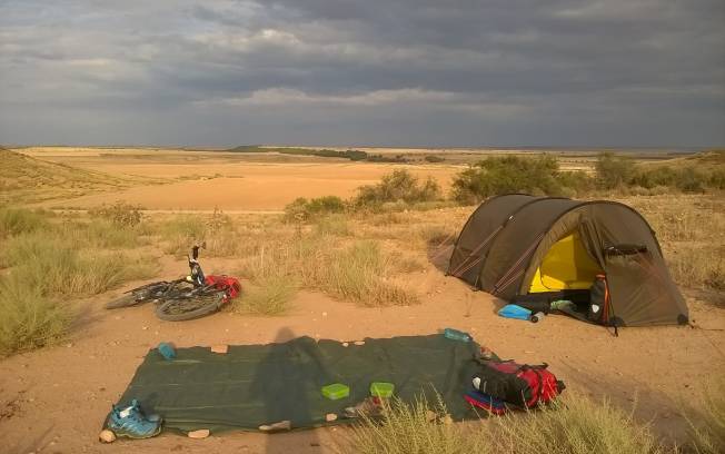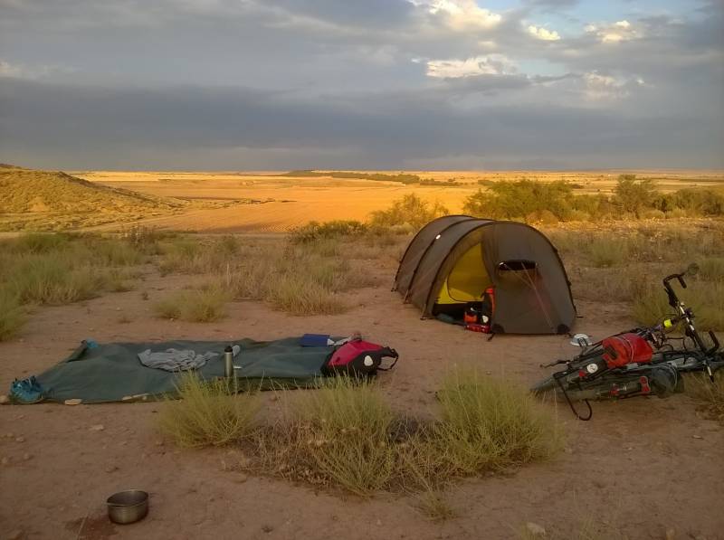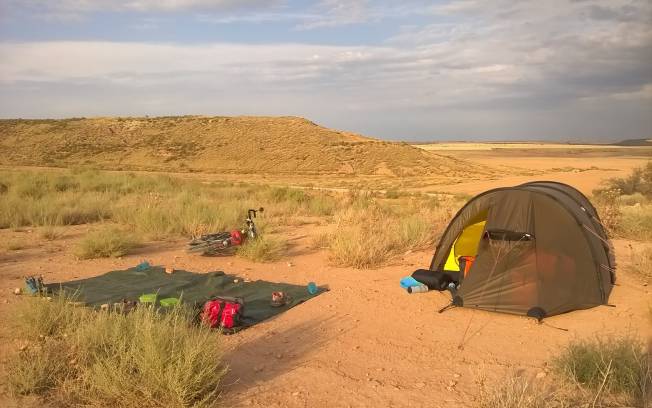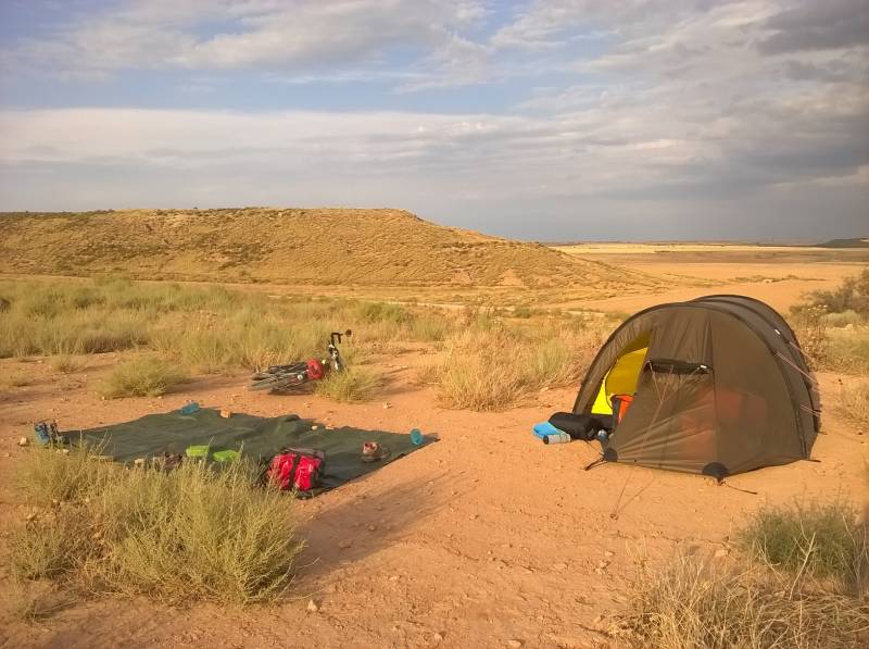 Bivouac au milieu du désert de Monegros, à 500m de la N-II et du Camino Catalan. Calme, nous n'avons croisé personne. Il y avait un peu de vent mais nous avons mis des rochers sur notre bâche pour éviter qu'elle ne s'envole. Faite le plein d'eau avant de venir