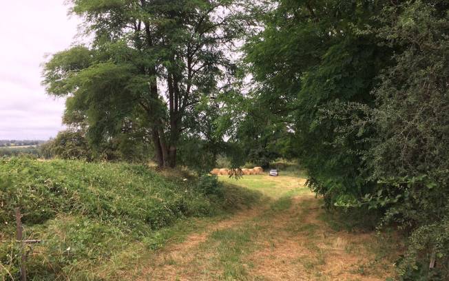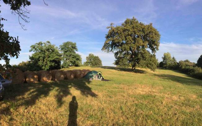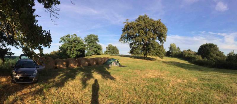 la parcelle est fréquement gérée par un agriculteur à en juger par les meules de foin entreposées et petit hangar à coté. On peut donc s'attendre à une rencontre qui devra dans ce cas rester courtoise, respectueuse et sincère avec l'éventuel propriétaire visiteur. (éviter les paroles du style "désolé on ne savait pas…" mais rassurer plutôt genre "ne vous inquiétez pas, nous repartons demain dans la matinée sans laisser aucune trace de notre passage.")