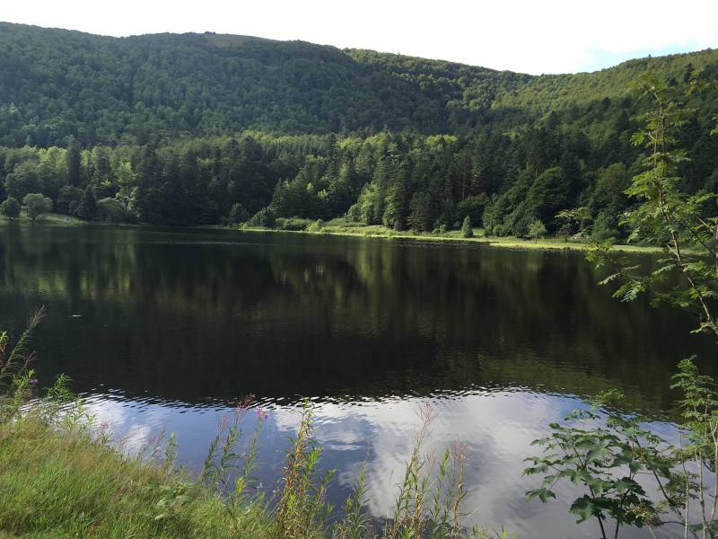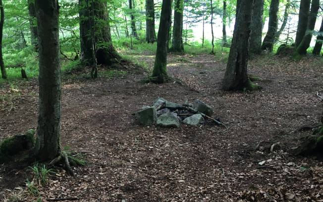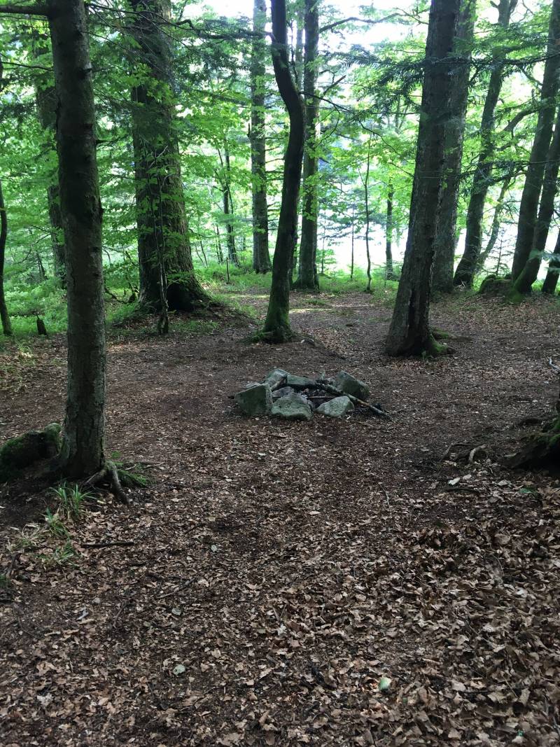 Il y a différents emplacements possibles, plutôt dans les bois à quelques mètres du lac ou sur l'herbe sur la rive directement.