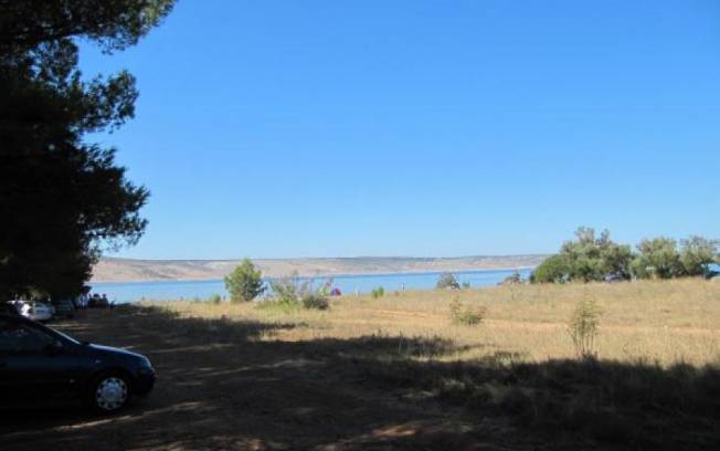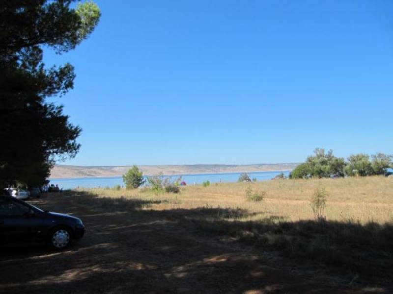 Grand parking en terre au bord de la mer avec des oliviers pour se faire de l'ombre