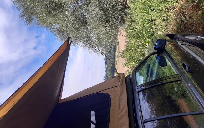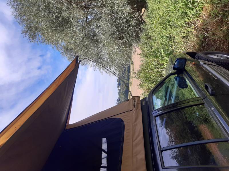 Pas d'ombre pour nous installer avec le 4x4 pour pouvoir déplier la tente de toit par contre pour mettre une tente au sol pas de soucis pour s'installer à l'ombre.