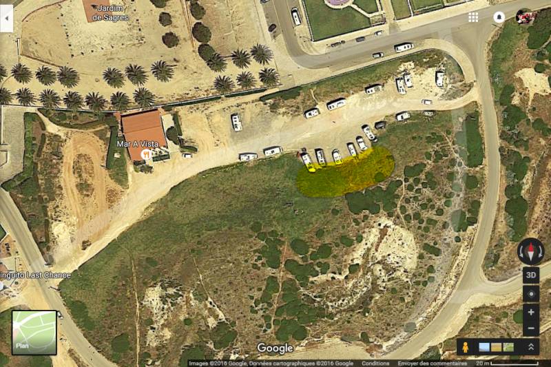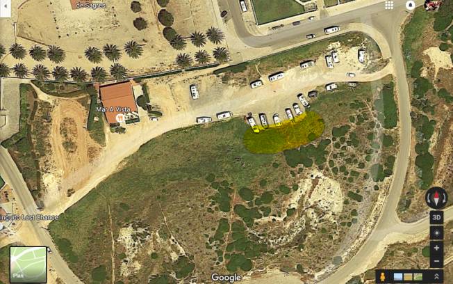 Fr : Au bord de la plage de Sagres, il y a un parking en terre où beaucoup de camping car viennent passer la nuit. Au bord du parking, juste derrière les camping car, il y a de l'herbe pour planter sa tente.