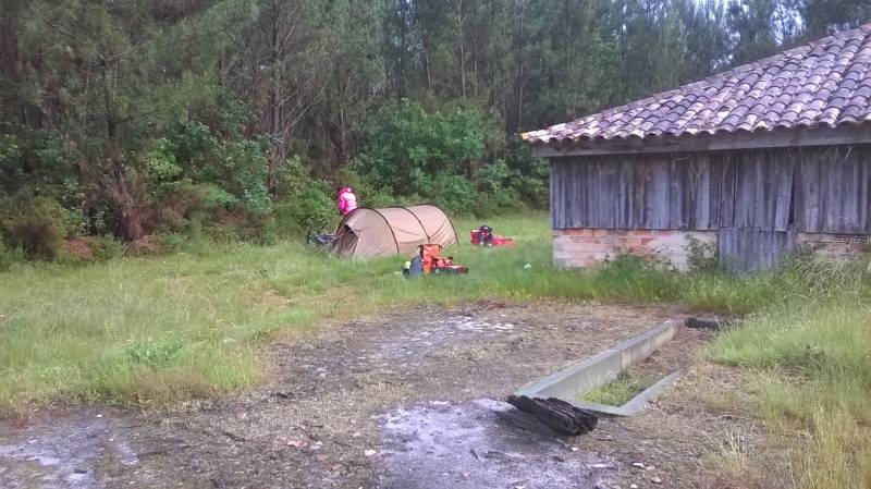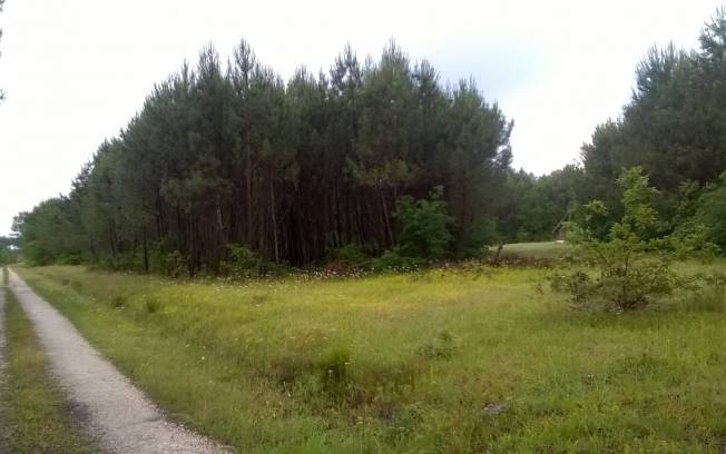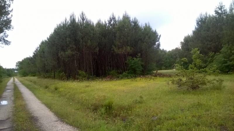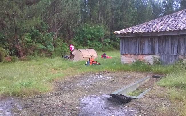 Bivouac à mi chemin entre Lacanau et Bordeaux le long de la piste cyclable. En pleine forêt, se trouve derrière une grange abandonnée. Le sol est totalement plat, il y a des hautes herbes et de la terre (contrairement à ce que l'on trouve tout autour). A l’abri des regards, nous y avons passé une bonne nuit.